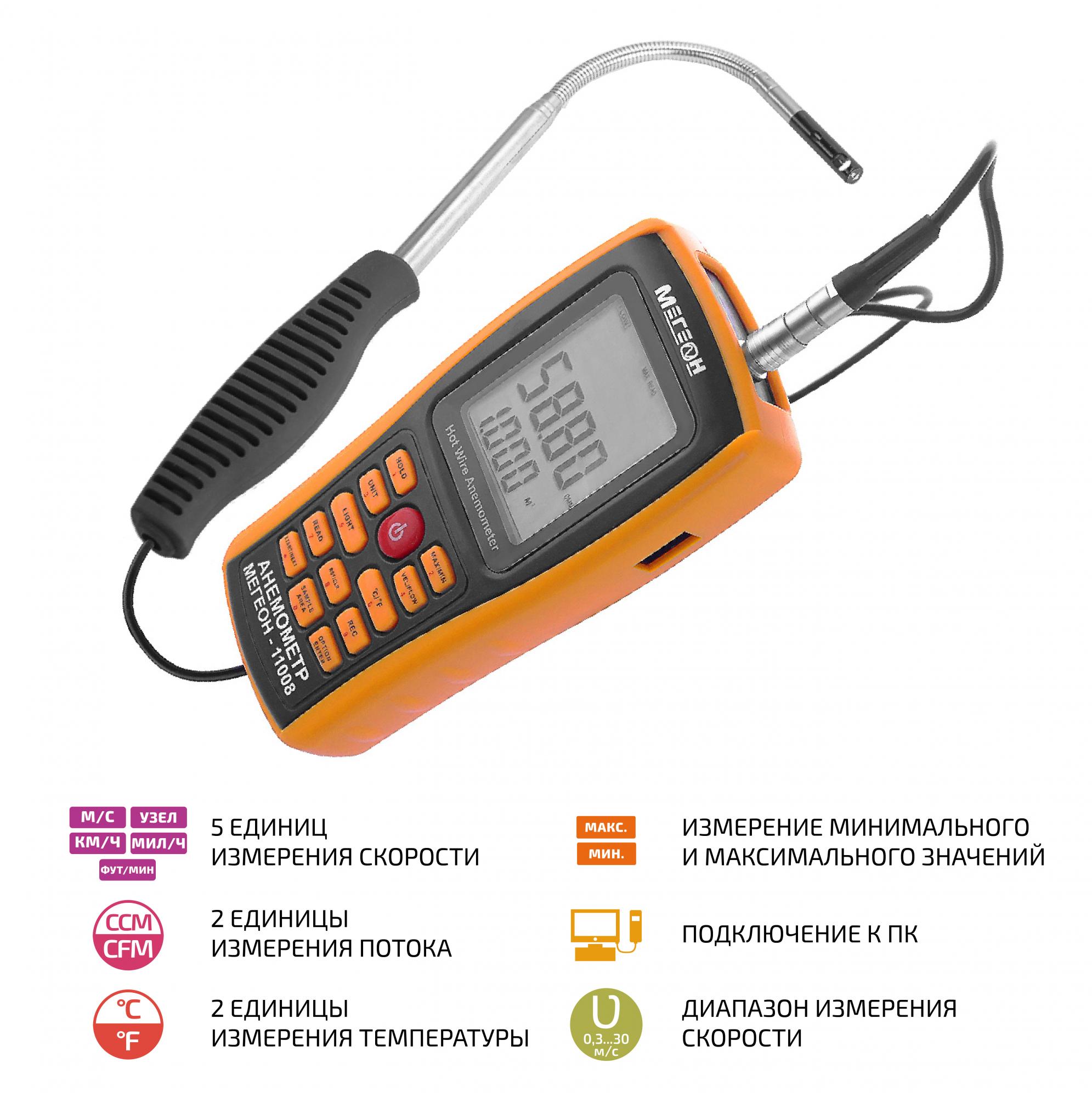 МЕГЕОН 11008 - новый высокоточный измерительный прибор, который дополнил серию термоанемометров компании МЕГЕОН. Главной отличительной особенностью данного анемометра является выносной телескопический зонд типа "нагретая струна" с высоким уровнем чувствительности, позволяющий производить исследования даже незначительных воздушных потоков. Благодаря телескопическому зонду анемометра МЕГЕОН 11008, Вам больше не придется использовать лестницу или стремянку во время работы с прибором, что в свою очередь существенно повышает уровень безопасности во время проведения измерений. Стоит отметить, что данный тип анемометра качественно отличается от приборов другого типа, а именно крыльчатого анемометра. За счет компактного размера измерительного зонда, Вы можете проводить измерения в самых труднодоступных местах, чего не может обеспечить ни один крыльчатый анемометр. Кроме определения скорости воздушного потока, термоанемометр МЕГЕОН 11008 имеет богатый набор дополнительных функций: поддержка нескольких единиц измерения, измерение температуры потока воздуха, вычисление массового расхода воздуха. Измерительный зонд оснащен яркой светодиодной подсветкой, что обеспечивает комфортное проведение измерений даже в плохоосвещенных помещениях. Наличие интегрированной памяти позволяет сохранять до 500 результатов измерений.