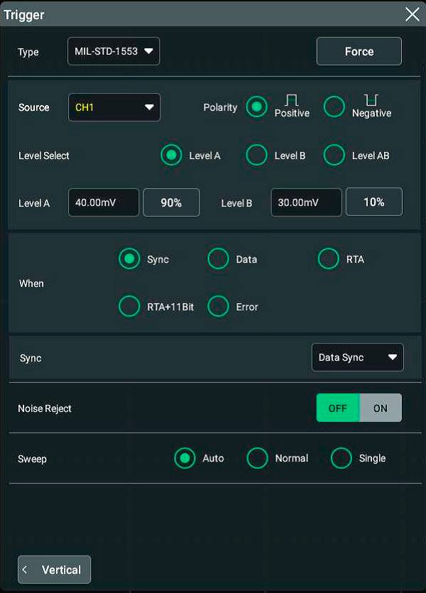 Программная опция DS80000-AEROA активирует в осциллографах RIGOL серии DS80000 возможность запуска, декодирования и анализа сигналов последовательной шины передачи данных MIL-STD-1553.